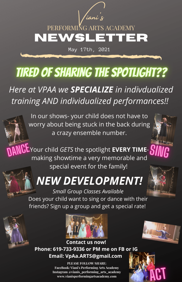 Here at VPAA we not only specialize in individualized training but also individualized PERFORMANCES! See our flyer here for more information-